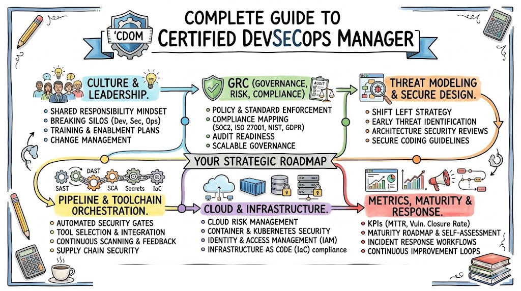 | Certified DevSecOps Manager | DevSecOps | Manager | Working engineers, tech leads, architects, and managers leading secure delivery | Comfort with DevOps basics, CI/CD, cloud fundamentals, and basic security concepts | DevSecOps governance, secure SDLC, CI/CD security, risk management, culture change, metrics, compliance mapping | Build DevOps + security basics → gain 1–2 real projects → take Certified DevSecOps Manager |